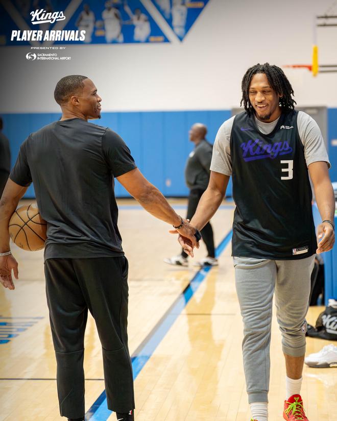 威少已经前往国王队报到,正式签约后手持国王18号球衣亮相,新赛季他将改穿18号并且开启生涯第18个赛季;今日国王众将在UCLA球馆中进行日常训练,威少首次以国王球员的身份参加训练,单手托球且满脸笑容,右手上戴着护指,与新队友艾萨克-琼斯击掌。